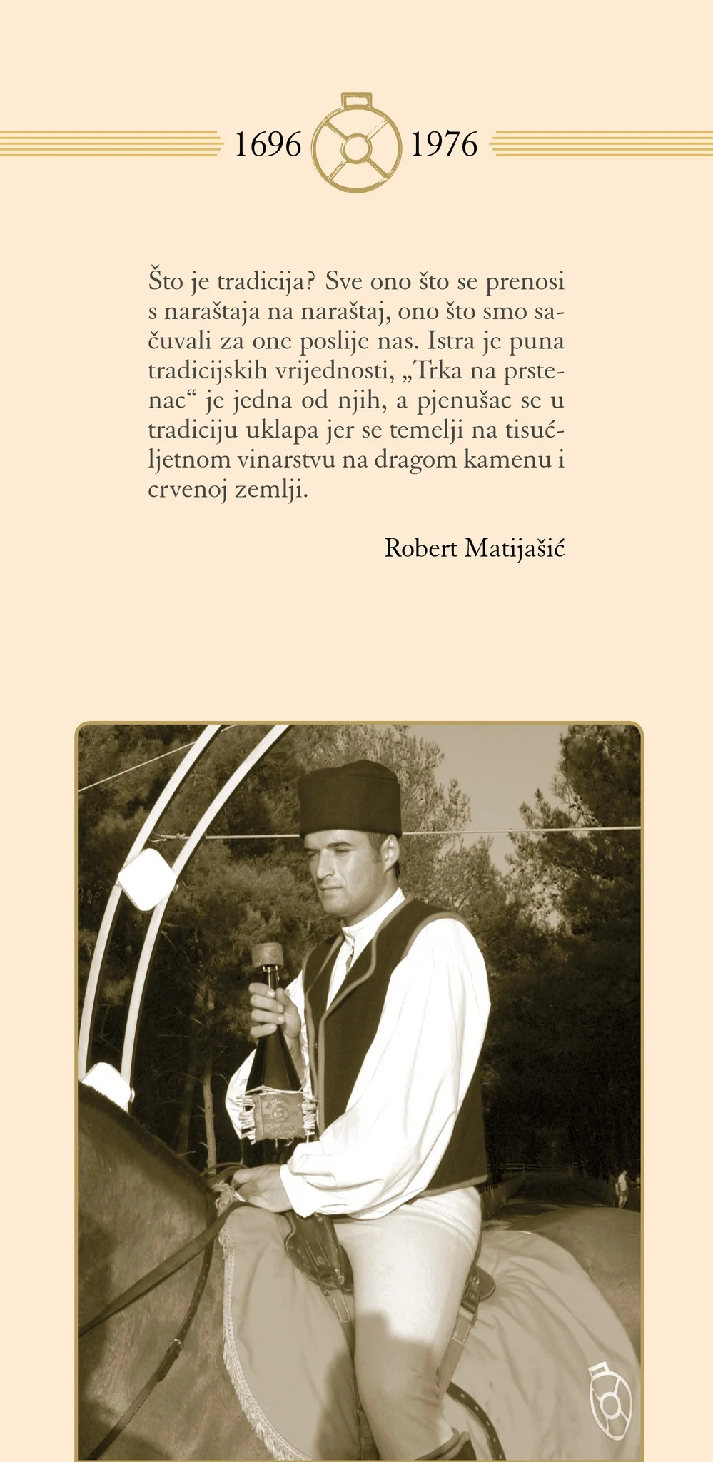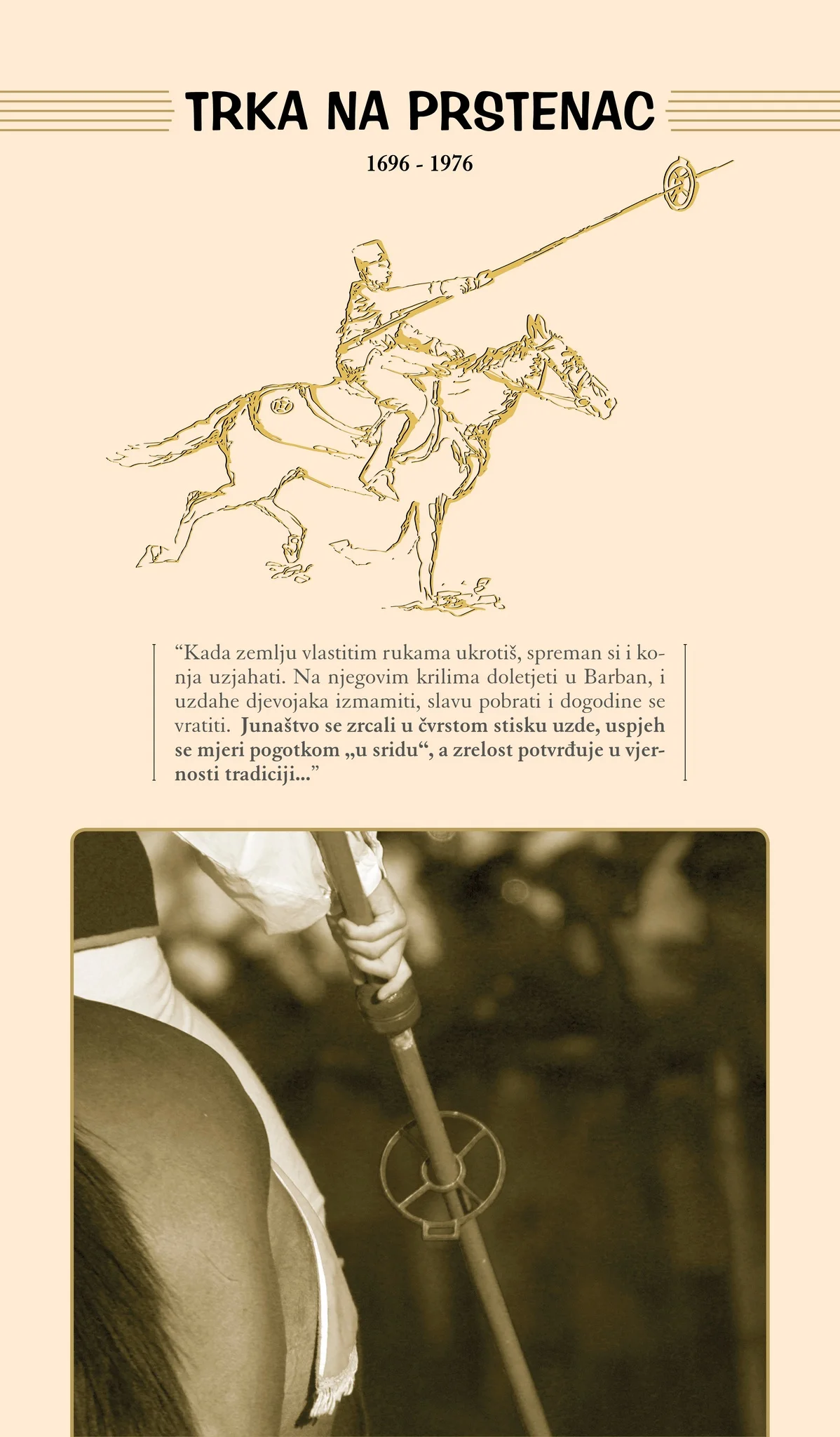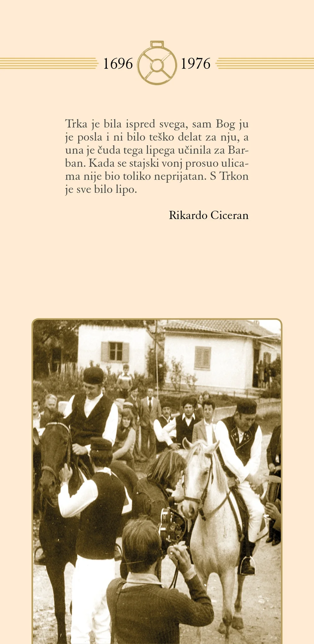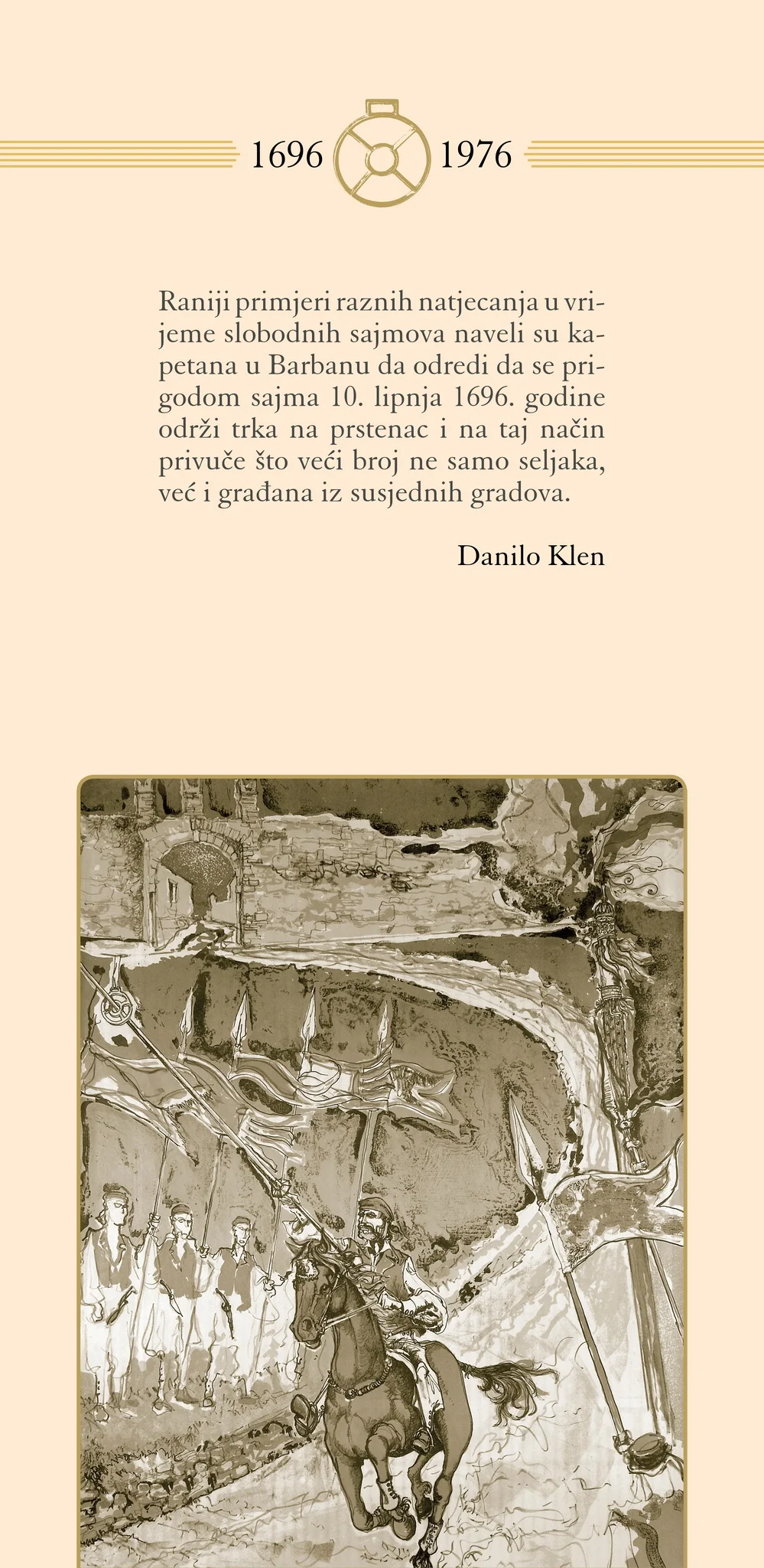 Od davne 1696. godine, Trka na prstenac ponosno čuva duh junaštva, vještine i zajedništva. Ova viteška igra, u kojoj se hrabrost i umijeće jahača mjere preciznim pogotkom u prstenac, postala je simbol Barbana i cijele Istre. Kroz stoljeća, Trka je rasla u snazi i značaju, spajajući povijest i sadašnjost, ljude i običaje, natjecanje i slavlje.