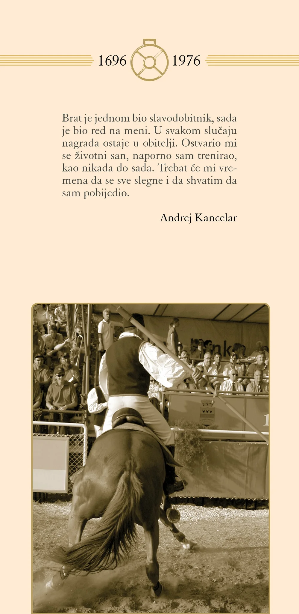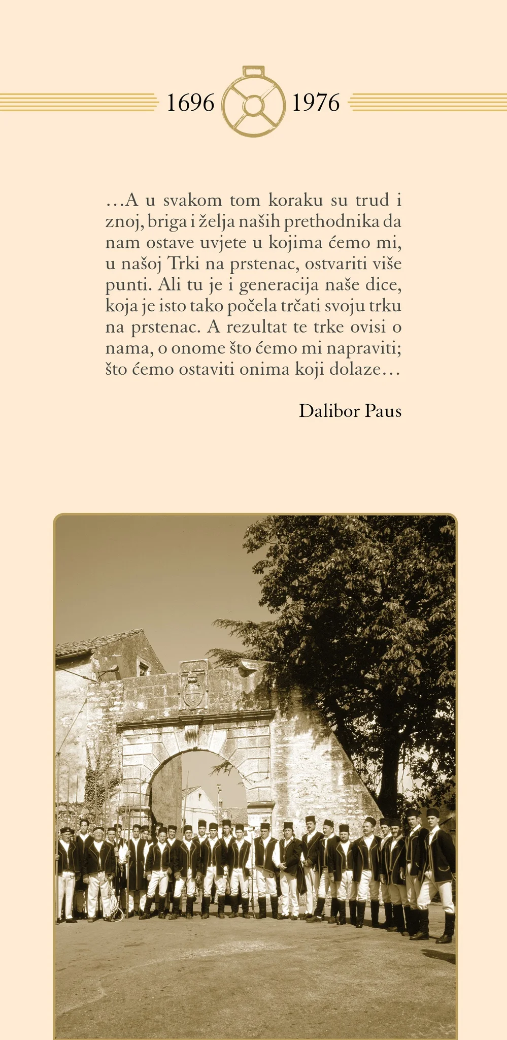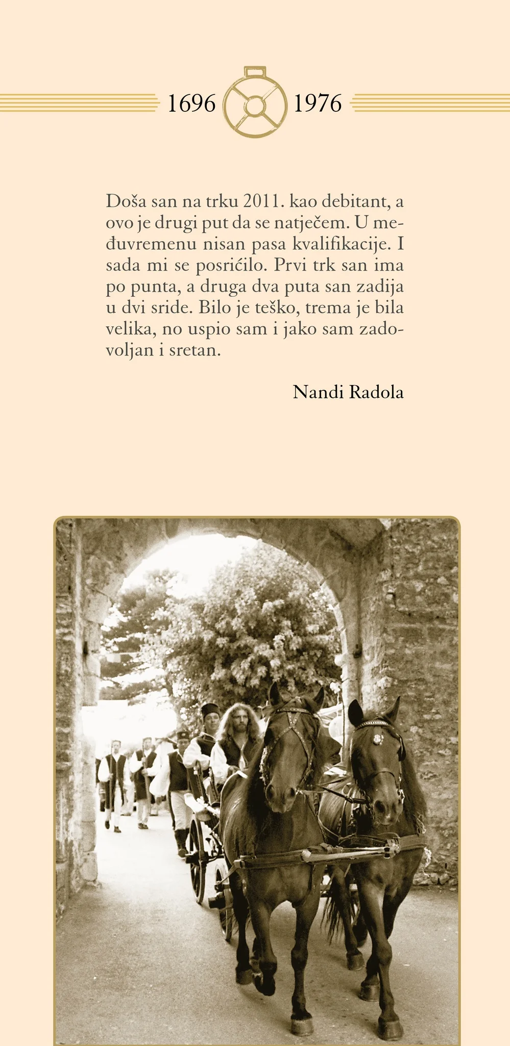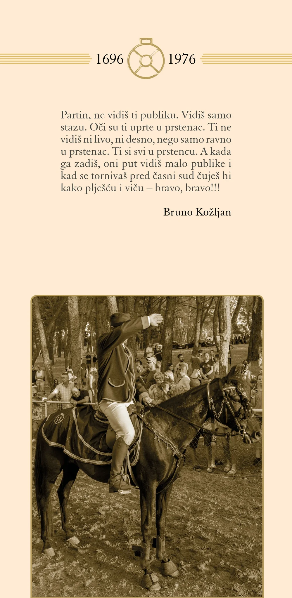 Od davne 1696. godine, Trka na prstenac ponosno čuva duh junaštva, vještine i zajedništva. Ova viteška igra, u kojoj se hrabrost i umijeće jahača mjere preciznim pogotkom u prstenac, postala je simbol Barbana i cijele Istre. Kroz stoljeća, Trka je rasla u snazi i značaju, spajajući povijest i sadašnjost, ljude i običaje, natjecanje i slavlje.